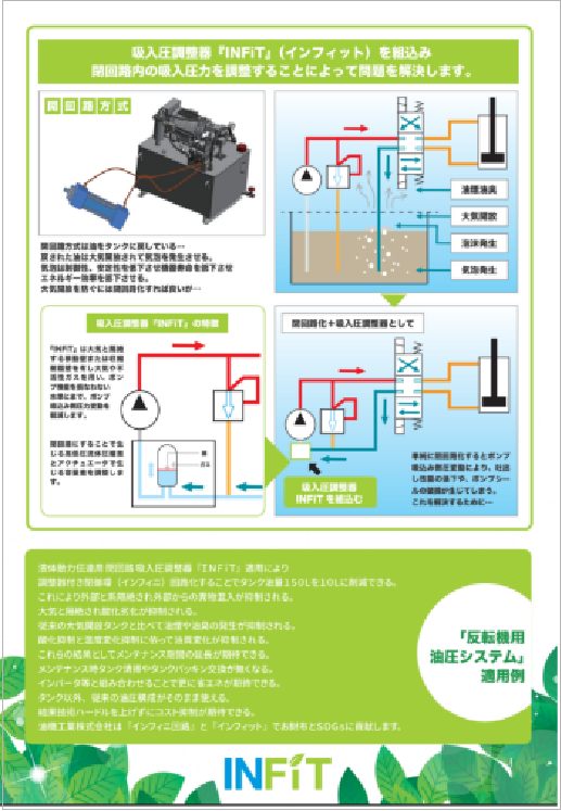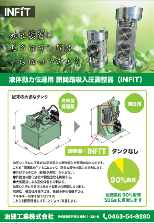 特殊油圧 Special hydraulic HOME > 特殊油圧 1978年から培い続けた特殊技術(特許油圧、センサリング、電気制御[PC、PLC、マイコン他])でお客様のお困りごとを解決します。 機械装置設計製作、特殊シンダー設計製作、お客様の「ああしたい」「こうしたい」にお応えします。 INFIT技術 ≫ 油圧装置 ≫ 油圧サーボ ≫ 自社ソフト ≫ INFIT技術 INFiT 紹介動画 技術動画 INFiT紹介CM INFiT 特徴紹介動画 INFiT 特徴 PDFデータダウンロード パンフレットダウンロード ▶ INFiT型 VS 従来型 温度比較データ ▶ 比較波形拡大 ▶ 油圧装置 油圧、給油ユニット類(中:制御含) 金型制御用120L油圧ユニット 15MPa水グリ簡易サーボ 食品機械用オイル滅菌装置 油圧、給油ユニット類(大) 工作機用2000L油圧ユニット 油圧サーボ 防音槽付き加振装置 直動型サーボ弁加振シリンダー ノズルフラッパー型サーボ弁加振シリンダー 加振制御、強度限界(破壊)試験、シリンダー高速高精度位置決め制御等に実績有り制御波形種類:正弦波、三角波、矩形波、台形波(任意入力ステップ波形)、重畳波 加振性能例 周波数:50Hz 振幅:±0.1mm 推力:2kN 周波数:15Hz 振幅:±5mm 推力:20kN 強度限界試験、インパルス、応力試験、高速高精度位置決め例 速度:5000mm/sec 推力:5kN 精度:0.1mm 速度:3000mm/sec 推力:20kN 精度:0.01mm ※制御ソフトにて速度、加速・減速度、位置等を任意に設定出来ます。 DDV型サーボ加帳 電動サーボ加帳 DDV加振、電動サーボ+ボールネジ加振装置等実績もございます。 自社ソフト 試験装置類(自社ソフト) PCデータロガー 入力8ch、1msサンプリング、各種任意設定可能 PC波形生成ソフト 正弦(sin)波、三角波、矩形波、各々の重畳波任意台形波、周波数、オフセットなど各種任意設定可能 高速位置決め装置用PC制御ソフト ステップ位置登録機能到達速度設定、加速・減速設定現在位置表示手動制御(速度任意設定)機能付き この他、当社では各種試験装置に応じて専用の制御ソフトやサンプリングソフト、 解析ソフトを各種用意しております、新規開発も致します。
